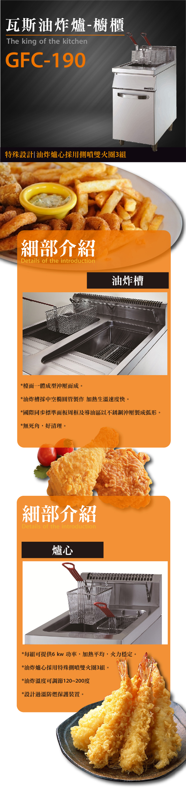 油炸爐心採用特殊側噴雙火圈3組,加熱平均。
