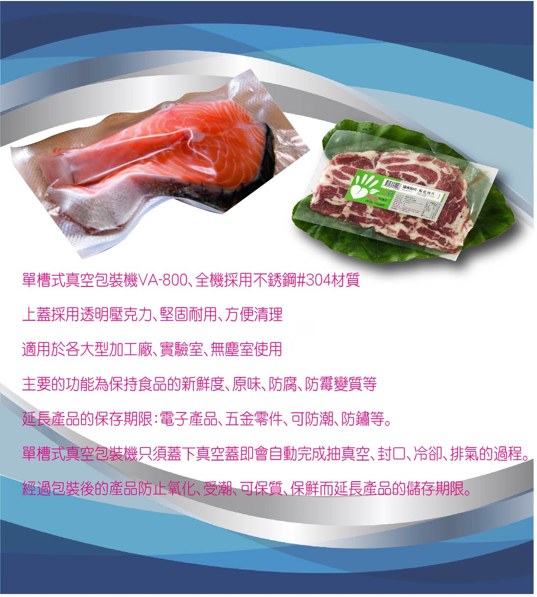 單槽式真空包裝機VA-800、全機採用不銹鋼#304材質